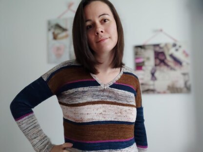 YarnThis sweater is knit with a yarn of type Fingering weight. For my A sage neckline version, I used different scraps of yarn. For my version B deep neckline I knitted in plain.