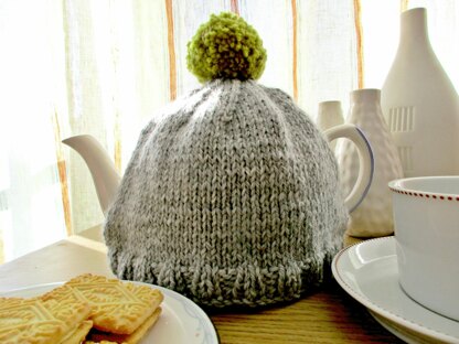 This is a pattern for a Pom Pom Tea Cosy. This is a really simple pattern, fine for beginners. The main part is is stocking stitch, with 2 x 2 rib base and knit 2 together decreases to shape the top. the top is finished with a contrasting colour pompom. The sample used exactly one ball of the main colour. I have suggested two balls on the materials list and have written 55 gms on the pattern to take into account different tensions.