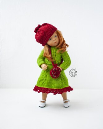 The pattern for knitted outfit includes a description of knitting Jacket, skirt, hat, gaiters, bag.