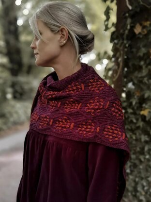 The Pomegranate shawl is worked flat beginning from one corner, with increases added at the left edge of the shawl. A wide panel of cable & eyelets is worked along the right edge, with double moss stitch along the increasing edge. Once knitting is complete, the "seeds" in a contrasting color are created by threading the yarn through the eyelets.