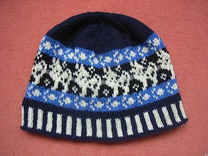 It is a "plain coloured" beanie with a band of white Pomeranians and a cute paw peerie to go with it.