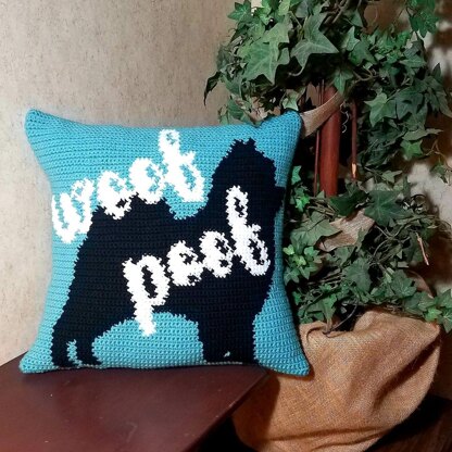 Pattern includes instruction and tips for how to do intarsia crochet, specific instructions for THIS particular pattern and a colored graph. “I Love This Yarn” brand yarn was used for this pattern, however any medium weight (#4) worsted weight yarn with comparable colors can be used. Front of the pillow has the pomeranian art, the back is plain Sea Blue.