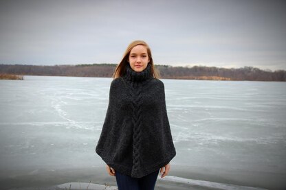 I designed this poncho as an easy adaptable knit for multiple body sizes and shapes. The piece is worked from the top down and uses simple increases with a centered cable on both the front and back. The chunky weight yarn makes it very warm, so it can be used as outerwear on a cool day or a cozy garment to throw on during a winter day inside.