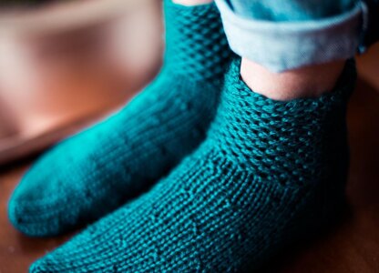 These socks feature a soft and cozy textured cuff, with a simple knit/purl texture along the foot. Perfect for hanging around the house, or going out for walk!