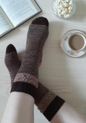 Popcorn Coffee socks are worked from cuff to toe. The sock is designed for a foot measure 24 cm. The cuff is decorated with bubbles and the rest of the sock is worked simple one-row stripes.