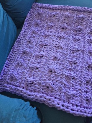 THIS IS A LOOP YARN FINGER KNITTING PATTERN. The Popcorn Garland Baby Blanket has a centre pattern with lines of purl stitches and puffed stitches and a pretty border of twisted stitches. NOTE: While this pattern is written for Red Heart Loop-It yarn, UK knitters can substitute Lion Brand Off The Hook Yarn for a blanket of approximately the same size.
