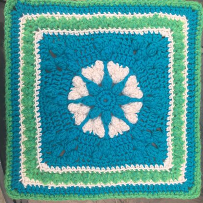 This is an intermediate square with Popcorns, a few post stitches, and basic crochet stitches.