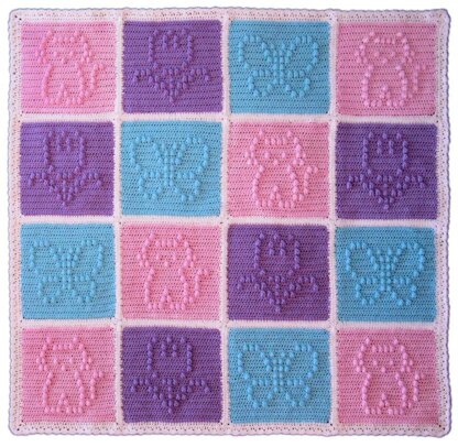 Using fun textured popcorn stitches to crochet the Kitty, Butterfly and Tulip motifs, this blankie is perfect for your new baby girl. Includes both line-by-line instructions and graphs for each square. Made with DK/ Light worsted weight yarns, blankie is 36 inches (92 cm) square.