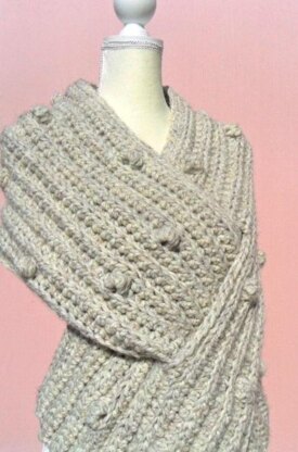 If you like big yarn, you will like this project. The pattern features rows of back loop stitches for texture mixed with bobbles for fun worked flat with a large slit in the front to secure the wrap.