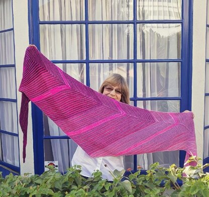 This shallow triangle design is knit from tip to tip. It increases in width, and then decreases after you reach the widest part of the triangle. The garter stripes form a graceful V shape and there are strips of simple eyelet lace to punctuate the design.