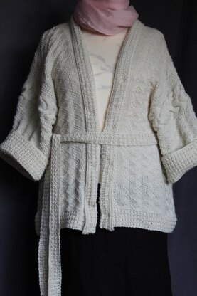 This is a plus size Kimono shape cardigan with an 8 row stitch pattern repeat featuring cables, Hurdle stitch and Linen stitch.