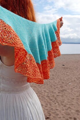 Inspired by summer days spent at the seaside with waves breaking gently on the shoreline, accompanied by comfy deck chairs and delicious ice cream. The shawl shaping creates a ripple of garter stitch that hugs the shoulders, keeping you warm as the cool breeze blows over you. The delicate, but easy to knit, lace border adds a touch of lightness to the sumptuous folds of each garter wedge.