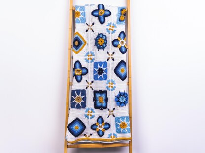 Portuguese Tiles was a Deramores crochet along in 2021. Inspired by traditional Portuguese tiles, this blanket is comprised of 5 differrent square designs. Each square has corner detailing that, when joined, forms flowers.