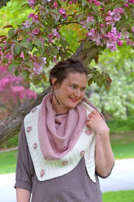 The Posey Shawl is a two-color triangular shawl worked from top-down. The main body of the shawl is sprinkled with little posies that are so fun to knit. The border is a 3 by 3 rib, worked in a contrast color that has a scattering of posies worked in the main color. Don’t let the border scare you – intarsia skills are not necessary to work these dainty posies!