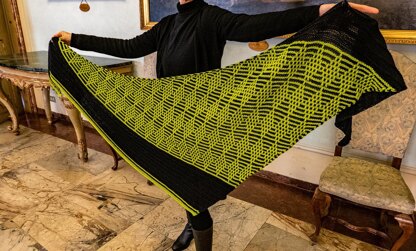 Positive Attitude is a two-color, boomerang shaped shawl created for worsted weight yarns. The first and last sections are in stockinette stitch with alternating garter ridges, whereas the section in the middle is worked in a slip-stitch (mosaic) pattern, which is easy to execute although it requires some concentration, making it an engaging and fun knit.