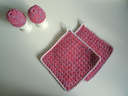 The Potholder and Egg Warmers crochet pattern are a perfect crocheted gift. It’s a easy crochet pattern, and also a quick make. They are perfect for any kitchen, with your choice of color it will turn out wonderful. The stitches makes the potholders thick & perfect.