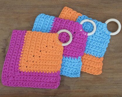 These bright, contemporary potholder would be fun in your kitchen or as a cute hostess, housewarming or shower gift. The wood rings make them easy to hang and add to the modern look. They can also be used as coasters.