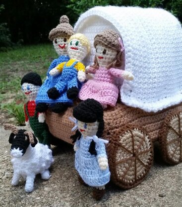 Some of the highlights of this pattern are: 1) Amigurumi characters- Pa, Ma, Sisters, Little Brother, and a black-faced English sheep! The sheep has never been released in any of my other animal bag toy patterns! 2) There are suggestions included, with links, for other Bizzy Crochet patterns to help you round out your traveling crew and livestock! 3) Constructing a covered wagon with plastic canvas and yarn. I promise it’s not hard..and there are LOTS of pictures to walk you through the whole process!