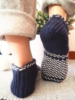 The slippers are knitted flat for the heel and then joined in the round for the rest of the foot. The toe is grafted with Kitchener stitch; both parts of the heel are joined with mattress stitch.