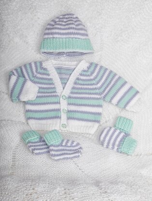 Use this supersoft machine-washable yarn to make a delightful set for an early arrival. It uses a very simple stocking stitch and 1x1 rib. Why stop at one set? Try varying the stripes or even just knit with a single colour.