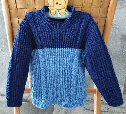 This child’s 8ply/DK, crew neck, set-in sleeve jumper is worked in cables and rice stitch. While I have elected to use two colours, it can be worked in just one if you prefer.