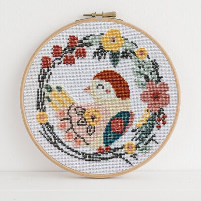 A lovely pretty bird in a beautiful floral wreath cross stitch pattern.