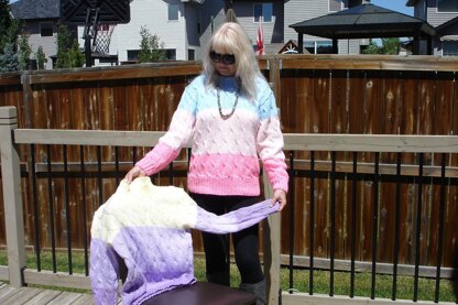 This is such a pretty pullover and a staple to your wardrobe. Mix and Match what ever colours you desire or just make it in one solid colour. It would be beautiful in cream over your jeans. What ever you desire you will make more than one. You'll be so glad you got this pattern. Shown in 36-38.