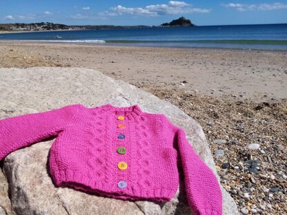 Knitting pattern for a pretty girl's cabled cardigan. Worked in 4 ply and with mismatched buttons for a fun look.