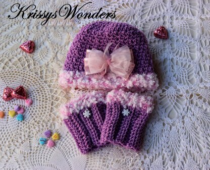 What a sweet hat and boot cuff set! This is an easy design that produces an adorable set for your little girl. The main body of the hat has the sweetest texture and a 4 worsted weight yarn is used. The brim can be trimmed with many different kinds of specialty trims. Bernat Happy (Number 6 weight) was used in the hats pictured.