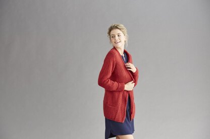 From the magazine: "Say hello to your new wardrobe favourite! Knitted in a super-soft mix of wools and polyamide, this cosy cardi is great for lazy Sundays. Thanks to it stylish stitches, it's also fab for spring walks and parties! It's all knitted flat and joined together at the end, with the neck picked up and knitted." The cardigan features two front pockets and has mock cables at the shoulders and neck, as well as rice stitch at the hem, cuffs, and neck for texture.