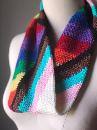 The Pride & Progress Cowl takes inspiration from the Progress Pride Flag created by Daniel Quasar. Like the flag, the cowl builds on the traditional rainbows, joining them with mitered stripes representing transgender people, people of color, and those impacted by HIV/AIDS. Its modular construction - four squares forming a continuous tube - symbolizes the progress we can make when we come together and prioritize inclusion.