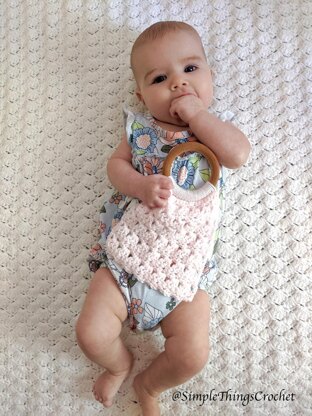 This adorable little teether is done in the primrose stitch. It makes a squishy and light fabric that’s perfect for little hands. Plus, it works up very quickly. You can also fold the bottom up to make a cute little tote for small items like a pacifier. Baby gifts, anyone? :) You will use much less than one skein of Lion Brand Baby Soft yarn for this project.