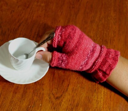 Wearing these fingerless gloves makes me feel like I'm a character in F. Scott Fitzgerald's The Great Gatsby, surreptitiously sipping a cognac cocktail from a teacup in a Roaring Twenties speakeasy. The gloves begin with a very feminine pleated cuff that is easy and elegant in appearance. The palm of the glove features an asymmetrical thumb gusset for a contoured fit. A yarn with tonal color adds interest to the stockinette stitch palm, but these gloves adapt well to most sock yarns, even the self-striping ones. Hello, Clara Bow!