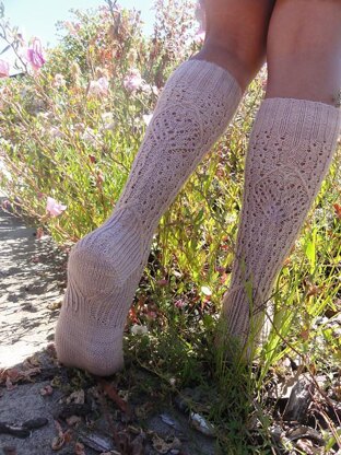 The word “prim” is often used to describe a someone who is very proper, tidy, and in most instances, a perfect lady. Primrose herself is a very ladylike, delicate character, and I wanted to reflect this in the shaping and design of this sock. It is a knee high sock, much like those worn by young school girls in 1940’s, 50’s and 60’s. The cuff and leg patterning form heart shaped ridges much like the edges of the primrose flower. The lace and rib work together to create a very slim fitting sock that is both delicate and strong, with a simple flower motif along the