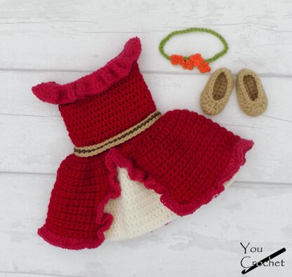 Directions for the headband, shoes and dress are included in 3 different sizes.
