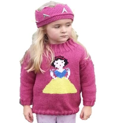 A knitting pattern for an Aran/Worsted Sweater and Crown featuring Snow White.