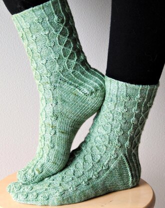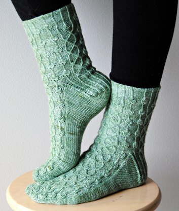 The socks are knitted from the toe up in the round. The pattern features a gusset-and-flap heel construction that doesn’t require picking up stitches. The twisted-stitch pattern is foot hugging, giving a comfortable fit on a wide range of foot sizes. Additionally, instructions are provided to adjust the length of the foot and leg to your measurements and preferences. Right and left socks are identical and can be worked two-at-a-time.