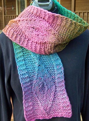 A knitted-in infinity symbol, in a gorgeous rainbow colorway makes this scarf stand out in a crowd. The chunky wool (sample shown is Rowan’s Colourscape in Kaliedescope) knits up quickly into this 6-inch x 54-inch scarf that is a bit of bright color for the dark, dreary days of winter.