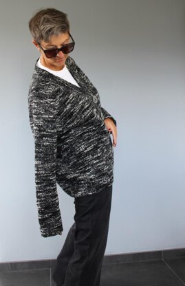 I knitted the black and white cardigan in size 5 with 40 cm (15.75“) positive ease. I like it oversized. The blue hat at the pictures is my pattern “Lottchen”, the scarf is “Mia Mia”.