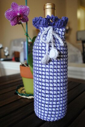 The bottom of this wine cozy is worked with 5.0mm regular hook, then change to 6.0mm double point Tunisian Crochet hook work for the body. When crochet in rounds, work loops on hook always with RS facing, work loops off hook always with WS facing. The Edge worked with the 5.0mm regular hook. 3.25mm regular hook for the chained lace. MC: Purple CC: White