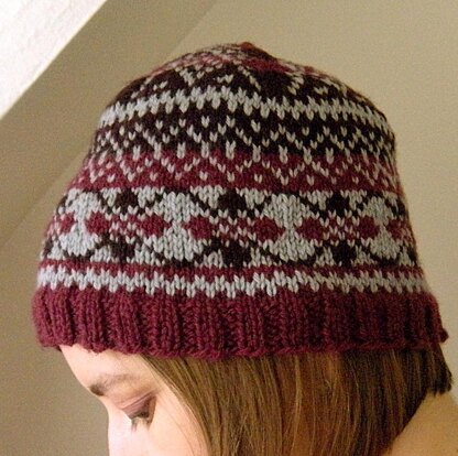 This hat is a simple beanie with an interesting stranded design from just above the brim all the way through the crown decreases. It took several attempts to get these motifs to flow into each other well, and in order to accommodate the six sizes the hat is offered in, there are three different stranded knitting charts.