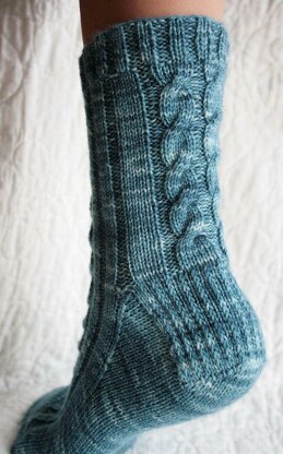 An easy cabled sock with reinforced gusset heel and rounded toe. With ribbed detail, cables run down the centre front & back. these are quick to knit and have a good amount of stretch. Pattern fits an average ladies sized foot.