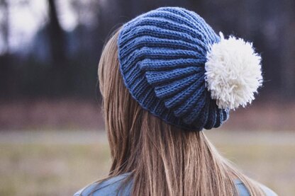 The hat is very stretchy, and fits a variety of head sizes. The soft ribbing flows smoothly into a ribbed-look slipped-stitch pattern. A multiple yarn pompom completes the look by being a flirty textured topper (optional).