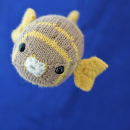 The little puffer fish is knitted up in colors that I thought were pretty close to nature, but to be honest, I think he would look great in just about any combination of colors. You could even leave out his stripes altogether for a super quick knit. He works up so fast, you’ll have a whole school in no time at all. This fish is knitted on double pointed size US 3 needles in the round and shaped with simple increases and decreases. As with all Yarnigans patterns, the puffer fish can be sized up or down by using thicker or thinner yarn and appropriately sized needles.