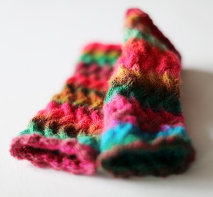Pulswärmer sind unerlässlich, wenn es kühl ist, aber noch nicht kalt genug für warme Handschuhe. Diese hier sind ca. 20 cm lang und 16cm weit im Umfang. Das entspricht etwa Größe S. Durch das Muster sind sie jedoch sehr dehnbar in der Weite. Die Anzahl der angeschlagenen Maschen muss immer teilbar sein durch 6. Durch das versetzte Muster entsteht der Eindruck der geflochtenen Oberfläche.