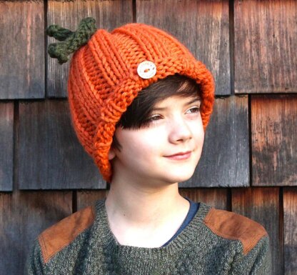Knit a pumpkin hat for Halloween, Thanksgiving or Fall. This pumpkin beanie hat is a fun way to keep the cold out for the whole season! Complete with stalk and curly tendril. Roll back the brim or roll it down - style it your way. A satisfyingly quick knit.