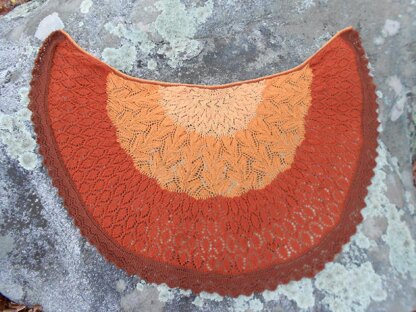 Pumpkin Pie (Pi) Shawl is a cozy, warm--hued shawl inspired by the Elizabeth Zimmerman’s Pi shawl formula. Instead of being completely round, this shawl drapes snuggly around the shoulders, in delicious pumpkin colors. The knitting is easy to work, with charts, as well as written directions. You knit this back and forth on a circular needle, with fingering weight yarn. Then, the outer edge is worked sideways, and knitted together with the live stitches on the needle. And for a simple finishing touch, you pick up stitches at the top and work a garter stitch border using all your colors, then, work a stretchy bind off.