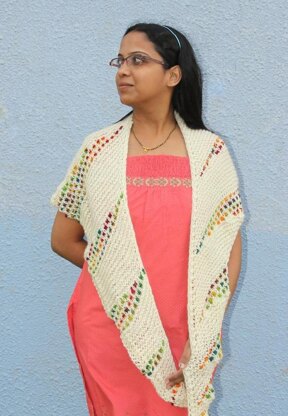 Punto shawl uses the variegated yarns to its benefit by breaking up the colors using slipped stitches. Use the same CC yarn as shown in the sample or be adventurous and use different yarns for each wedge. Instead of using variegated yarn, you can use different solid yarns for each wedge.