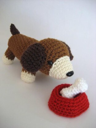 This listing is for my original crochet amigurumi puppy pattern with food bowl and bone. This pattern is super easy, and I have included lots of photos to help you along the way! Materials: Worsted weight yarn Size G crochet hook Yarn needle 1 pair 9 mm safety eyes 1- 18 mm animal nose (can be purchased at 6060.etsy.com ) Stuffing
