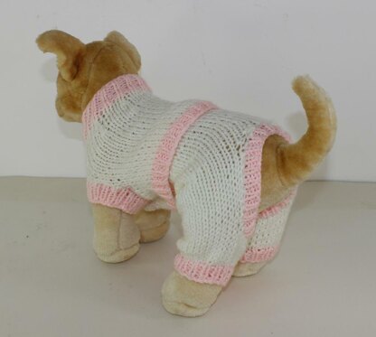 This is my Puppy Pyjamas knitting pattern. These wonderful pyjamas are perfect for young puppies and small dogs and make them look super cute. They are worked flat in any aran thickness yarn of your choice. The knitting pattern provides full instructions for 3 puppy and small dog sizes: Small (length neck to tail 7-10 inches ,chiahuahua), Medium (length neck to tail 10-13 inches, terrier) & Large (length neck to tail 13-16 inches, Jack Russell). There are step by step photos to help you throughout. This knitting pattern is available to buy here.